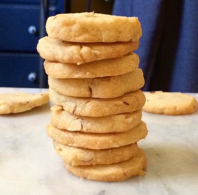 These vanilla-almond shortbread are a breeze to put together. We cream butter and sugar together before adding in vanilla bean paste and just a touch of almond extract. Then we mix in flour and salt, followed by sliced almonds. Next, we form the dough into two logs, wrap them in plastic wrap, and throw them in the fridge for a little bit. Then we just slice them and bake at 325F for 14-17 minutes. All that’s left to do is make a pot of tea and dunk away.