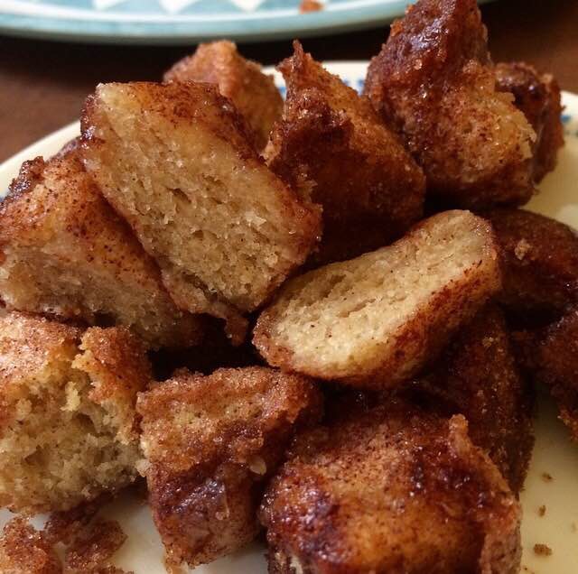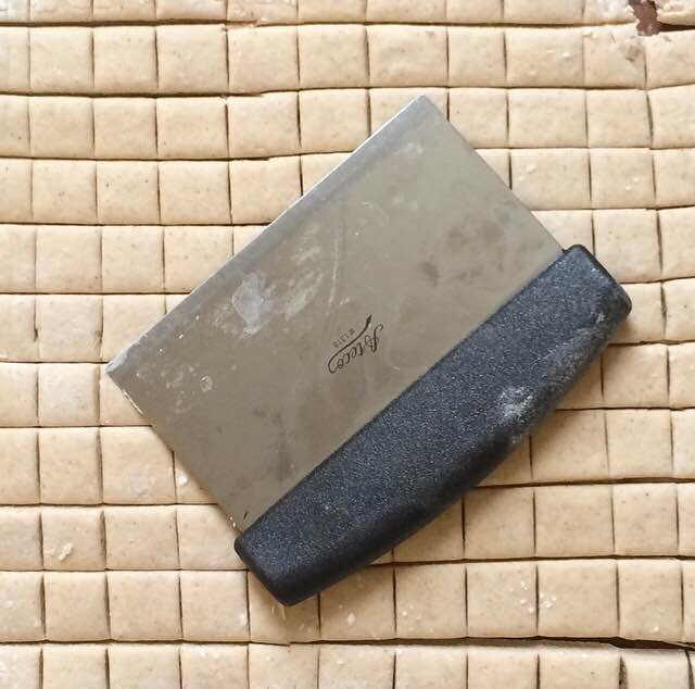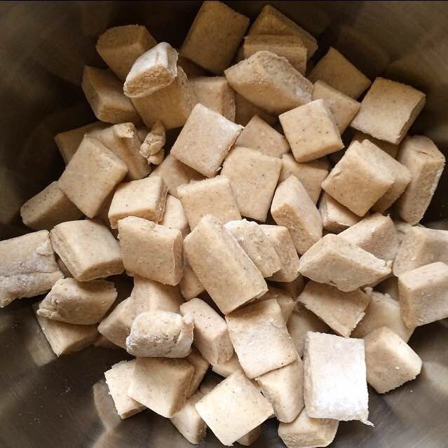 Anyway…stir together the flour, sugar, cinnamon, sea salt, and baking powder. Then, using a silicone spatula, stir in the cream. Make sure to scrape the sides and bottom of the bowl to get any cream and flour that have adhered themselves incorporated into the dough. Turn the dough out onto a floured surface and flour a rolling pin. Roll the dough into a large rectangle that is 1/2-3/4″ thick. Then fold it in half and turn it one quarter-turn. We’ll repeat this folding and rolling until it’s been done four times total. This will give us great layers. Once you have done all the folding and rolling and once again have a 1/2-3/4″ thick rectangle, cut the dough into one-inch squares. To do this, use a sharp knife or bench scraper (my tool of choice) and cut directly down. Do not saw, or you will deflate all those layers you just worked so hard making. Put the squares aside while we make the coating.