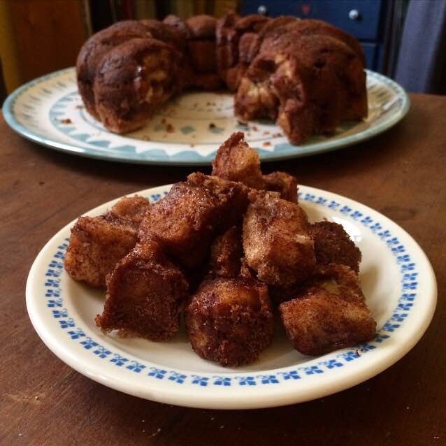 Melt 1 1/2 sticks of butter, and put it in a small bowl to cool a bit. It should still be warm, but as we have to touch it directly, the butter shouldn’t be super hot. In another bowl, whisk together light brown sugar, granulated sugar, and four teaspoons of cinnamon. Now, using your hands, take five biscuit squares at a time, dunk them in the butter, coat them in the cinnamon-sugar, then lay them in a pan that is very, very, VERY well-greased with butter. We don’t want our Monkey Bread to stick when we turn it out after baking. Once all your squares have been coated and are in the pan, press down on them lightly to make sure they stick together. Bake the Monkey Bread for 40-45 minutes, until it springs back when pressed with clean fingers. Let it cool for just a few minutes before flipping it onto a platter. Serve it immediately. Everybody will love this soft, sticky, sweet treat.