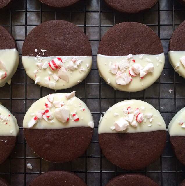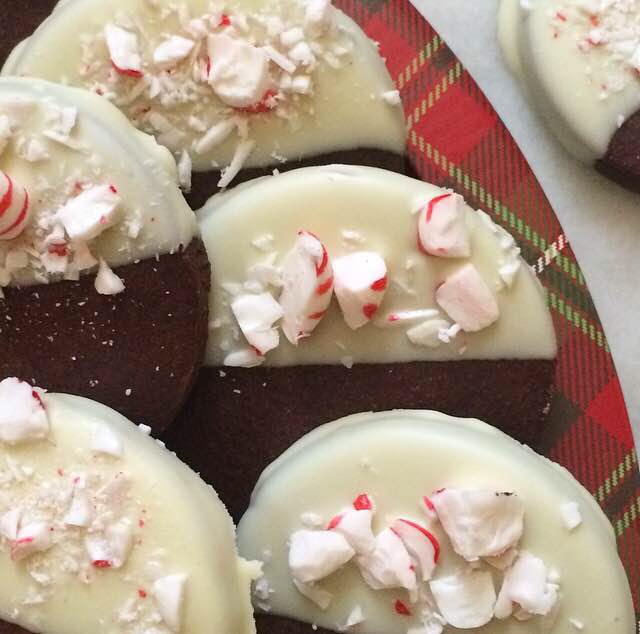 Prepare the White Chocolate Dip. In a double-boiler or the microwave, melt white chocolate and coconut oil, stirring frequently. Dip cooled cookies halfway into the white chocolate mixture before setting them on a rack. Sprinkle crushed peppermint candies over the white chocolate. Repeat dipping and sprinkling with all cookies. Let cookies sit at room temperature until set, or briefly refrigerate cookies to set.