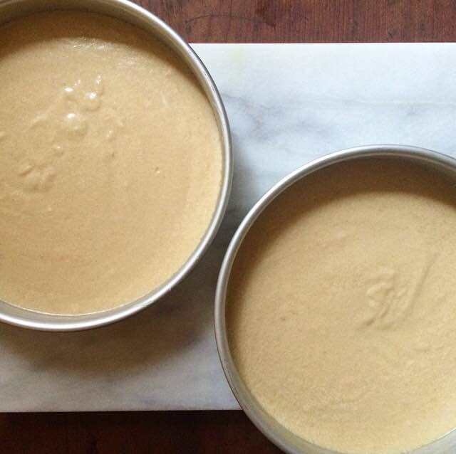 Divide batter evenly into prepared pans. Tap each full pan on the counter five times to release any large air bubbles. Bake cakes 32-37 minutes, rotating top to bottom and back to front at the halfway point. Cakes are done when a toothpick inserted in the centers comes out clean. Let cakes cool in pans for fifteen minutes. Run a small thin knife around the edges of the pans and invert the cakes onto cooling racks to cool completely.