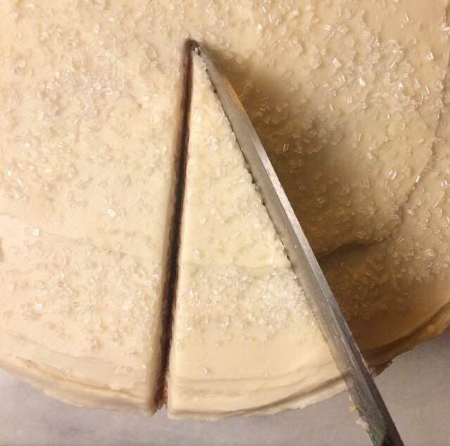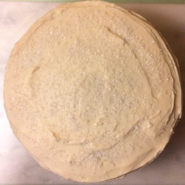 Transfer one layer of the cake to a cake stand or plate. Frost and layer cooled cakes. Top with sprinkles or decorative sugar immediately after frosting, if desired.