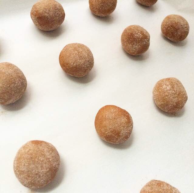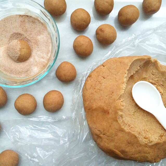 Scoop the dough by the tablespoon, and roll into balls. Roll each dough ball in the coating mixture. Place dough balls at least two inches apart on prepared baking sheets. Bake cookies 8-10 minutes, until puffy and no longer raw-looking. Let cool on pans for ten minutes before removing to a rack to cool completely. Repeat scooping, rolling, and baking with any remaining dough.