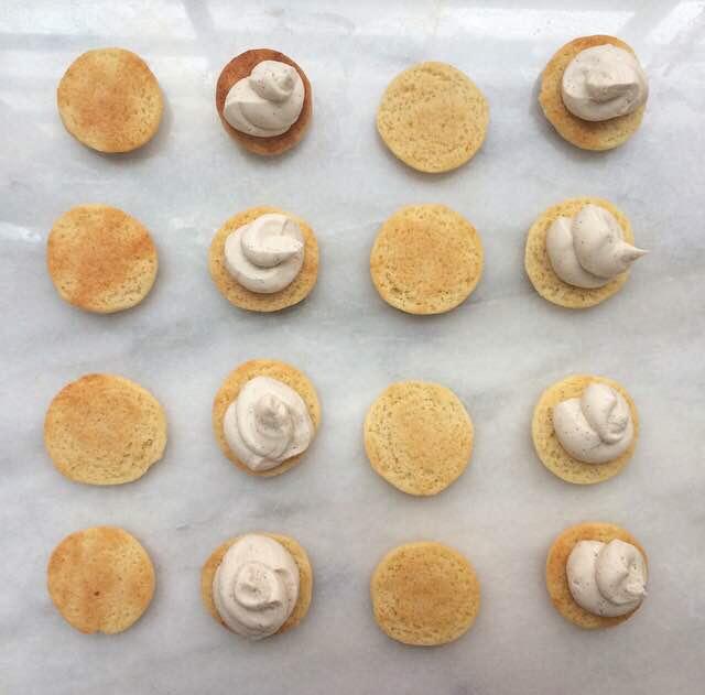 1. To assemble a sandwich cookie by piping, apply filling by piping a circle in the middle of the underside of one cookie, leaving about 1/4″ around the edge. Top with a second plain cookie, with the underside filling-side-in. Repeat until all cookies have been used.