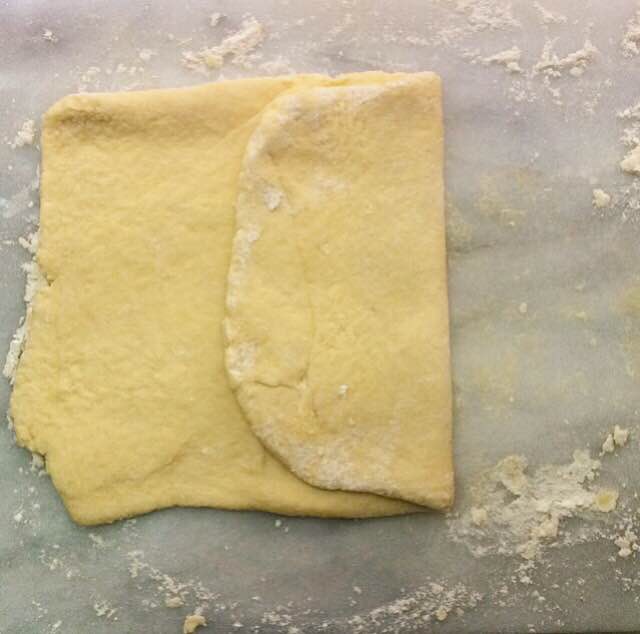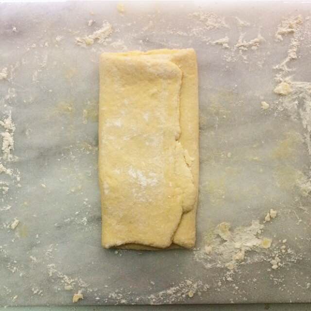 Flour a surface and a rolling pin. Turn dough out onto surface, and use your hands to pat it into a rough square. Roll the dough into an 8×10″ rectangle. Fold dough in thirds, and give it one quarter turn. Roll into an 8×10″ rectangle again, fold, and turn. Repeat rolling, folding, and turning until it has been done six times total. Wrap folded dough in plastic wrap and refrigerate for at least one hour, or up to 48 hours.