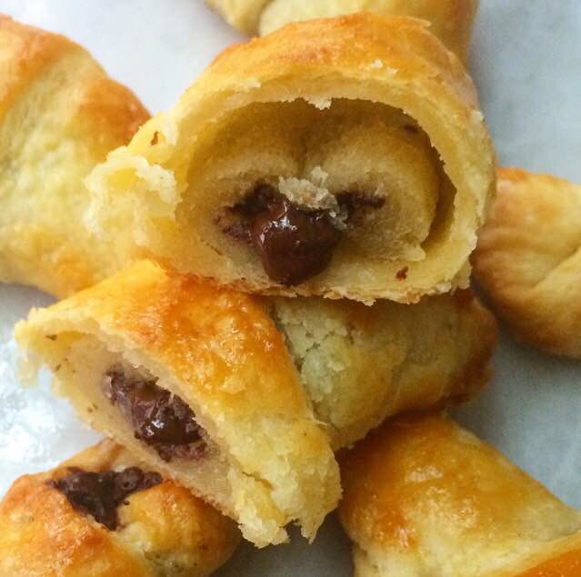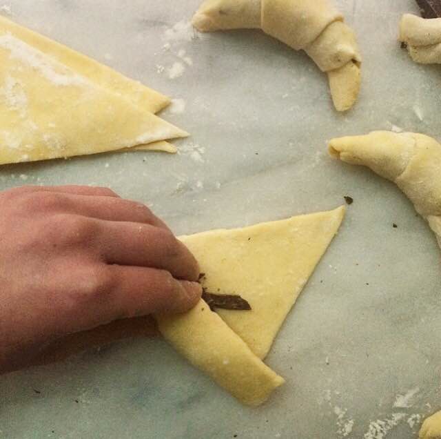 Take each triangle and place a bit of chopped dark chocolate near the short side. Use your fingertips to roll the short side over the chocolate, continuing to roll toward the point where the long sides meet. Shape the ends in any way you choose, and pinch any gaps together. If the dough gets warm or sticky at any point in this process, chill it briefly before continuing.
