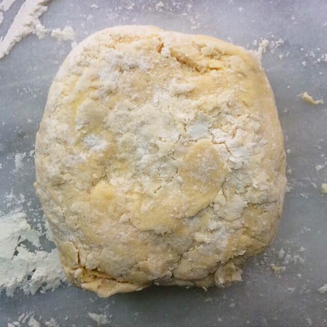 Basically, rough puff pastry is like making pie dough or biscuits–cold butter is cut into dry ingredients before liquid is added. After everything is stirred together, a shaggy dough forms. Be careful to keep everything cold; the butter must stay solid until it reaches the oven, or the dough will be tough instead of flaky and layered.