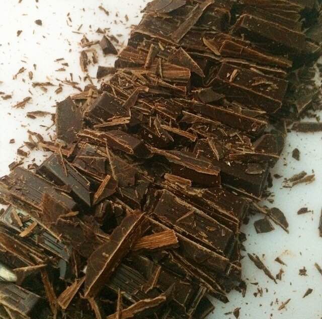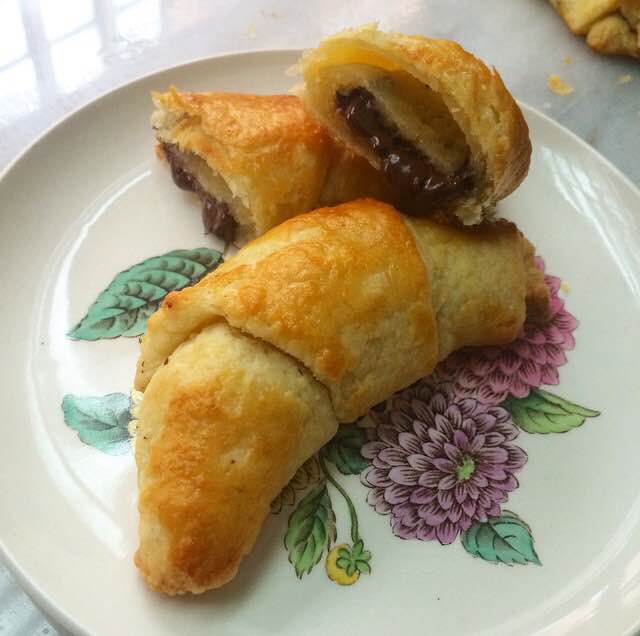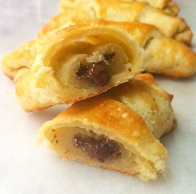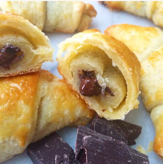 Flour a surface and a rolling pin. Unfold dough. Roll into a 12×18″ rectangle. Use a sharp knife or pizza wheel to cut dough into quarters. Slice each quarter diagonally so that you have eight triangles with two long sides and one short side. Place roughly 1 tablespoon chopped dark chocolate near the short side of each triangle. Use your fingers to roll the short side toward the pointed end where the two long sides meet. If there are any gaps, squeeze them together with your fingers. Repeat with all triangles.*