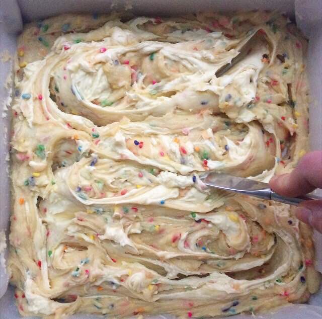 Make the blondie base. In a large mixing bowl, whisk together melted butter and sugar. Mix in eggs, vanilla, and imitation butter extract. Whisk in flour and salt. Use a silicone spatula or wooden spoon to fold in jimmies. Set aside 2/3 cup batter.
