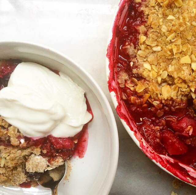 Place a rimmed baking sheet on the bottom rack of the oven to collect any overflow. Place assembled crumble on the top rack. Bake 30 minutes, tenting with foil if the crumble starts to brown too quickly. Let cool 10 minutes before serving with yogurt.