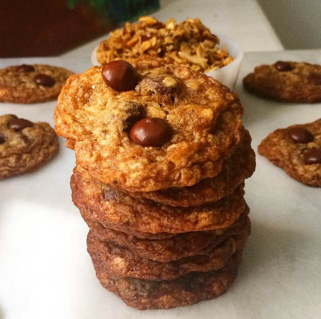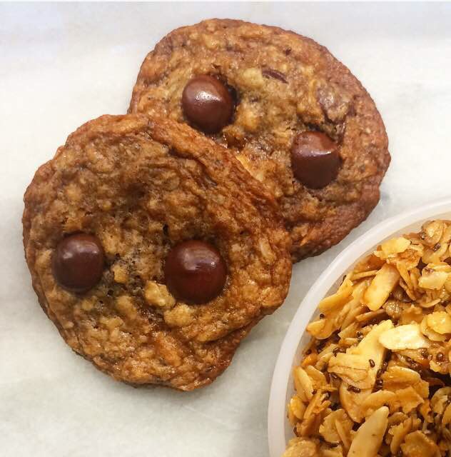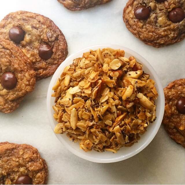 My current batch is a play on my Maple Pecan Granola, made with pecans and almonds, large flaked coconut, chia seeds, and brown rice syrup to encourage a little clustering. I usually eat it with yogurt and fruit, but last week, I got a little crazy and bypassed the breakfast option in favor of cookies.