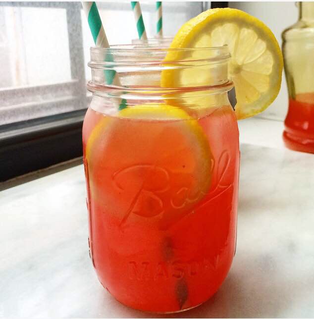 The recipe starts with making a lemony raspberry syrup. Throw some fresh raspberries, a couple of tablespoons of lemon zest, sugar, and water into a small saucepan, and cook it just until the berries start to fall apart. Let it cool for 30 minutes while you juice a bunch of lemons. Then strain the syrup into a pitcher and stir in the lemon juice and some cold water. Serve it over ice with a few slices of lemon and cute straws, and then relax for five whole minutes. Trust me, your to-do list can wait that long.