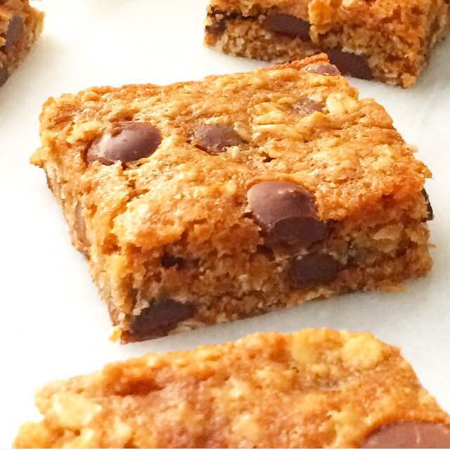 These Whole Grain Banana-Chocolate Chip Bars are my new favorite thing. They’re soft and chewy, like a combination between a blondie and a muffin, with a pronounced banana flavor and chocolate in every bite! And they’re just the slightest bit healthier than your average cookie. These bars are made with white whole wheat flour and old-fashioned oats, so they’re completely whole grain. I also cut the sugar in this recipe, but rest assured that they still taste like dessert!