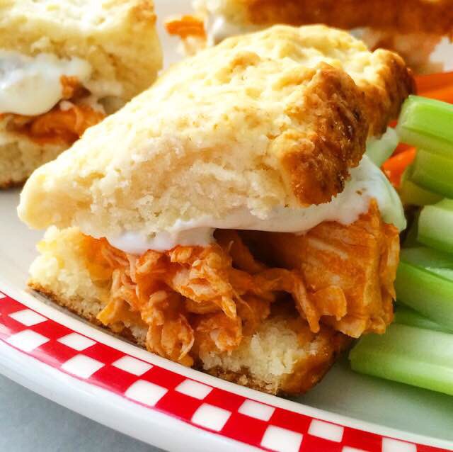 Now, to assemble. Remove the biscuits from the pan and slice them in half. Place the shredded buffalo chicken on half of the sliced biscuits, and spread the blue cheese dressing on the rest. Sandwich them together and serve with carrots, celery, and more blue cheese!