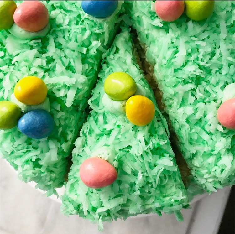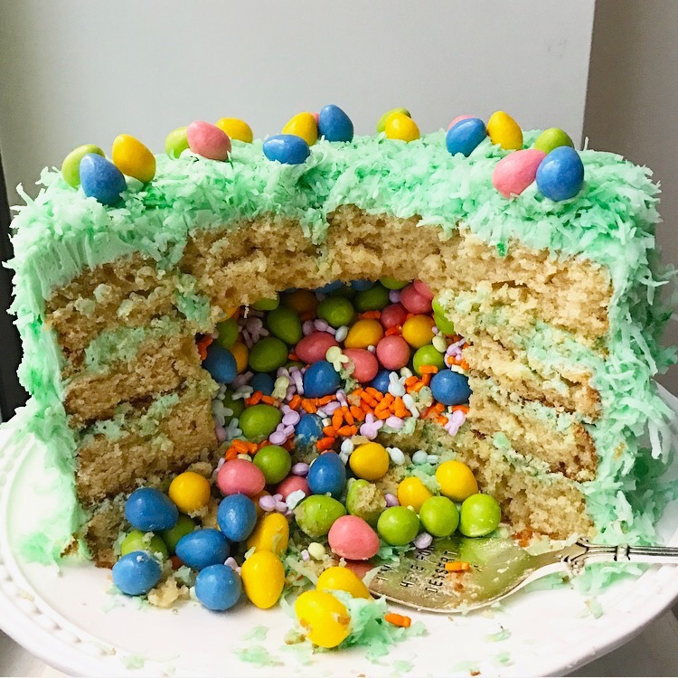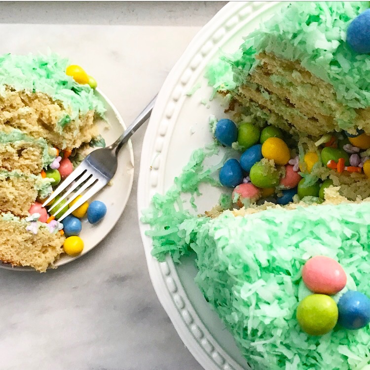 Place one of the cut-out layers on the frosted base layer. Top it with a layer of buttercream and the second cut-out layer. Frost that one too.Easter Egg Hunt CakeEaster Egg Hunt CakeSee that hole? Fill it with any egg-shaped Easter candy you like! I used Reeses Pieces Eggs, but you could use chocolate eggs or even jelly beans. I also added some little bunny & carrot-shaped sprinkles, because sprinkles are my love language.Easter Egg Hunt CakeAt this point, you should have one intact cake layer left. Use it to top the other layers, and then frost the tallest layer cake you’ve ever seen.Easter Egg Hunt CakeTo decorate, press dyed-green flaked coconut into the frosting, and then arrange some Easter candy on top. I found this easiest to do by piping little blobs of frosting over the coconut and sticking the candies to them.Easter Egg Hunt CakeAt this point, this cake will look like any old layer cake. Sure, it’s a huge one that’s clearly decorated for Easter, but nobody will suspect the surprise inside. And you, being cool as a freaking cucumber, will act like it’s any old vanilla cake.Easter Egg Hunt CakeBut then, you’ll start to slice the thing…