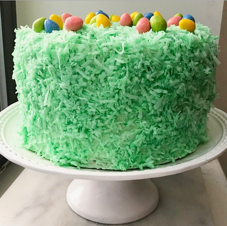 Use a 4-6 inch cutter (or a wide-mouthed cup or jar) to cut the centers out of two layers. Set centers aside for another use. Place one cut-out layer on the bottom layer and top with a layer of frosting. Place the other cut-out layer on top and frost. Fill the hole in the cake layers with candies and optional sprinkles. Top with the last (fully-intact) layer of cake. Frost cake as desired. Cover with dyed green coconut. Decorate with additional Easter candies as desired.