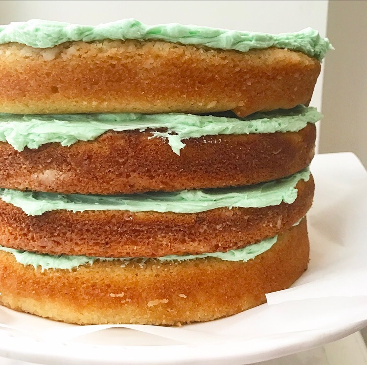 Let’s talk cake construction. First and foremost, bake and cool four 9-inch round cake layers and whip together a double batch of (dyed-green) vanilla buttercream frosting. Yes, four layers (1.5 times my standard recipe) and a double the usual amount of frosting. This cake is huge–gotta have plenty of space for all that Easter candy!