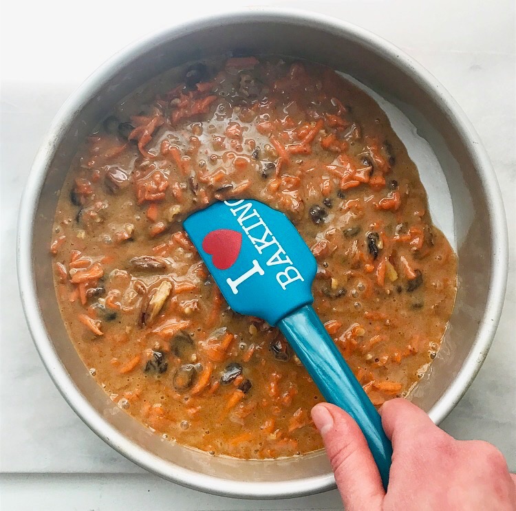 Raisins. Yes, raisins are in lots of Carrot Cake recipes, but they are often too chewy and prone to clumping together in the batter. That doesn’t happen in this cake. Nope. Instead of pouring the raisins in straight from the package, I soak them in boiling water while I prepare the batter. This allows them to plump up a bit and mitigates any clumping once they are folded into the batter. The soaked raisins also help keep the cake nice and moist. That comes in handy when you have two layer cakes lying around!