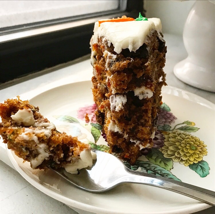 Cream Cheese Frosting. Yes, I know I’ve mentioned it twice already, but its tangy flavor really makes this cake sing. There is a thick layer on top each layer of cake–yum! The sides get a thin layer–just enough to hold up some chopped nuts. You could certainly skip the nuts and use more frosting on the sides, but I love the added crunch. I also dyed some of the frosting and piped little carrots on top of the cake. I’ve linked to a video tutorial in the recipe. It’s super easy.