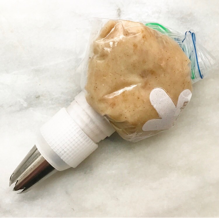 Load dough into a piping bag (or freezer bag–not a regular zip top bag!–with a corner snipped off) fitted with a large star tip. Pipe an inch or two of dough onto a clean surface, just to make sure everything is working properly. Put test dough back in the bag.