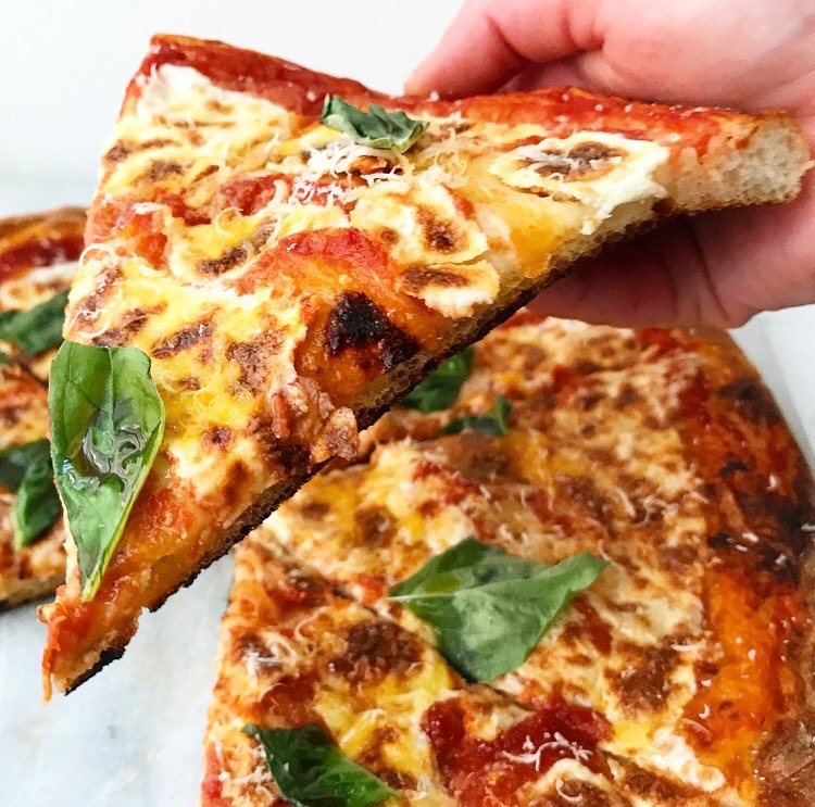 No, I did not eat eleven whole pizzas. Not even close. I tasted eight of them, gave a lot to my roommates, fed two to the family I work for, and deposited three directly into the trash. You see, I was on a mission. I wanted to see if I could make restaurant-quality pizza at home–without a stone, peel, or an oven that reaches 1000F.