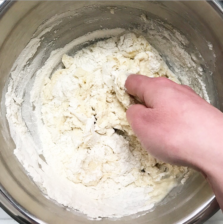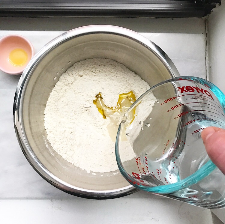 First things first–every great pizza starts with great dough. Mine is simple to make, doesn’t require any unusual flours, and comes together quickly. Just whisk together flour, instant yeast, sugar, and salt, then stir in water and olive oil until a shaggy dough forms. I find this easiest to do with my hand, but I’m sure a silicone spatula works too.