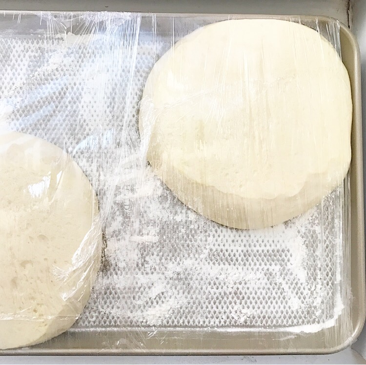 Flour a surface and your hands. Turn dough onto the surface and knead until smooth, about 7 minutes. Form dough into a ball. Divide dough ball into two pieces and form those into balls. Heavily flour a rimmed baking sheet (or two dinner plates). Place dough balls in opposite corners and brush any exposed dough with olive oil. Wrap pan in plastic wrap. Let dough rise in a warm, draft-free environment for 60-70 minutes, until doubled in size. Proceed with pizza-making.