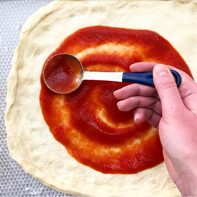 Next, top the pizzas. Today’s recipe is for a classic Pizza Margherita, topped with tomato sauce, fresh mozzarella, and basil. I like to use Pomi strained tomatoes for my sauce, but use any sauce you like. Spread it around each pizza crust, leaving the pinched border bare. Top them with torn fresh mozzarella and a drizzle of olive oil.