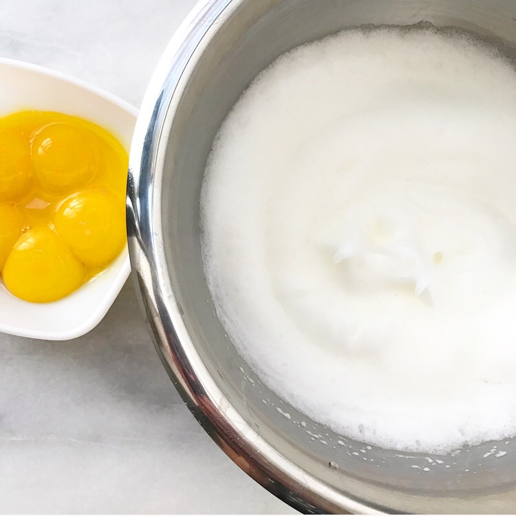 Continue adding the whipped egg whites in 1/4 increments, gently folding them into the batter.