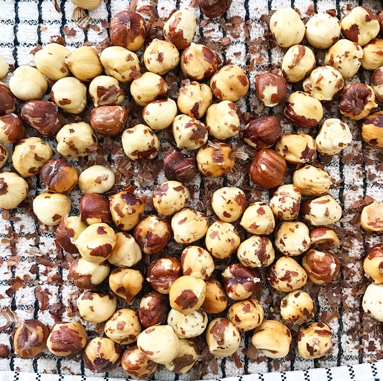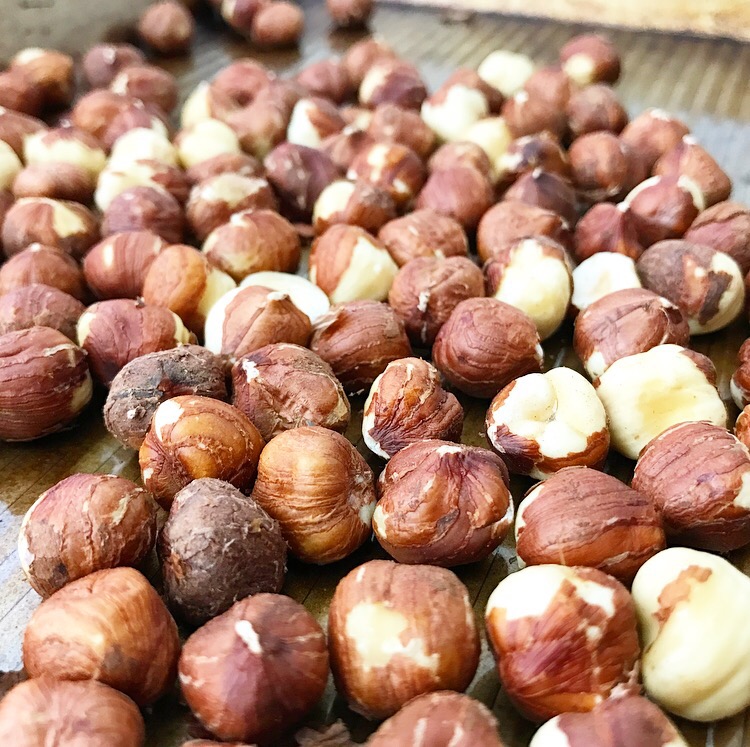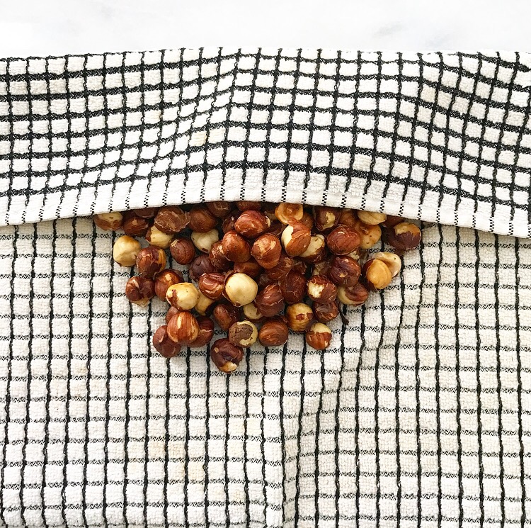 Place hazelnuts on a dry, rimmed sheet pan. Toast in the oven for 5-7 minutes, or until fragrant. Immediately transfer hazelnuts to a clean, dry, textured hand towel. Fold towel around the hazelnuts and then rub the towel with the palm of your hand. This will allow the hazelnut skins to loosen. This step does not have to be done perfectly.