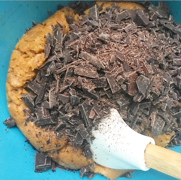In a separate mixing bowl, whisk together coconut oil, light brown sugar, and granulated sugar. Mix in pumpkin purée and vanilla. Use a silicone spatula (or wooden spoon) to fold dry ingredients into wet. Fold in chopped dark chocolate. Cover dough with plastic wrap and refrigerate at least two hours or up to three days.