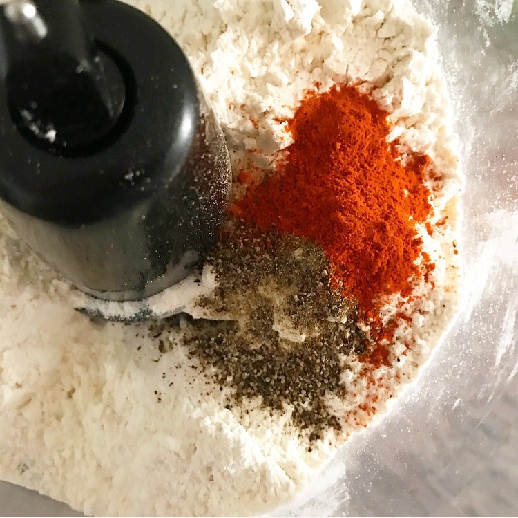 Put some flour, black pepper, cayenne, and salt in a food processor.
