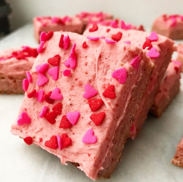 Strawberry Sugar Cookie SquaresDoes anyone else think it’s weird that strawberries are considered Valentine’s Day-appropriate? I mean, I get that they’re an aphrodisiac and that their red color goes with the whole lovey-dovey puffy heart aesthetic of the holiday, but strawberries aren’t in season in February.