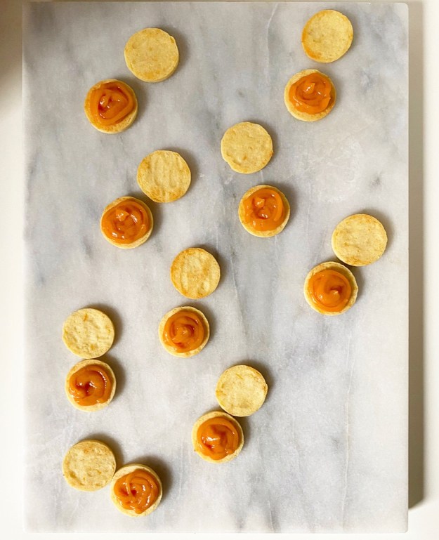 You may certainly eat these cookies right after assembly, but I highly recommend refrigerating them for about 6 hours before doing so. This allows the curd to set and the cookies to soften slightly so that everything stays in place when you bite in. You know, instead of falling apart in your hands. Not that that’s a bad thing.