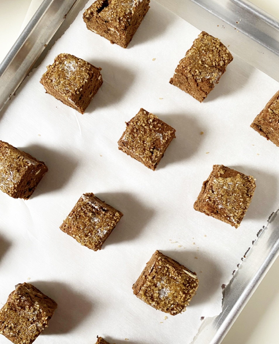 Turn dough out onto a floured (or cocoa powdered) surface. Give it 1-2 kneads before patting into a 1-inch thick rectangle. Flour a large, sharp chef’s knife before slicing the rectangle into 12 biscuits. Be sure to slice directly down—do not saw.