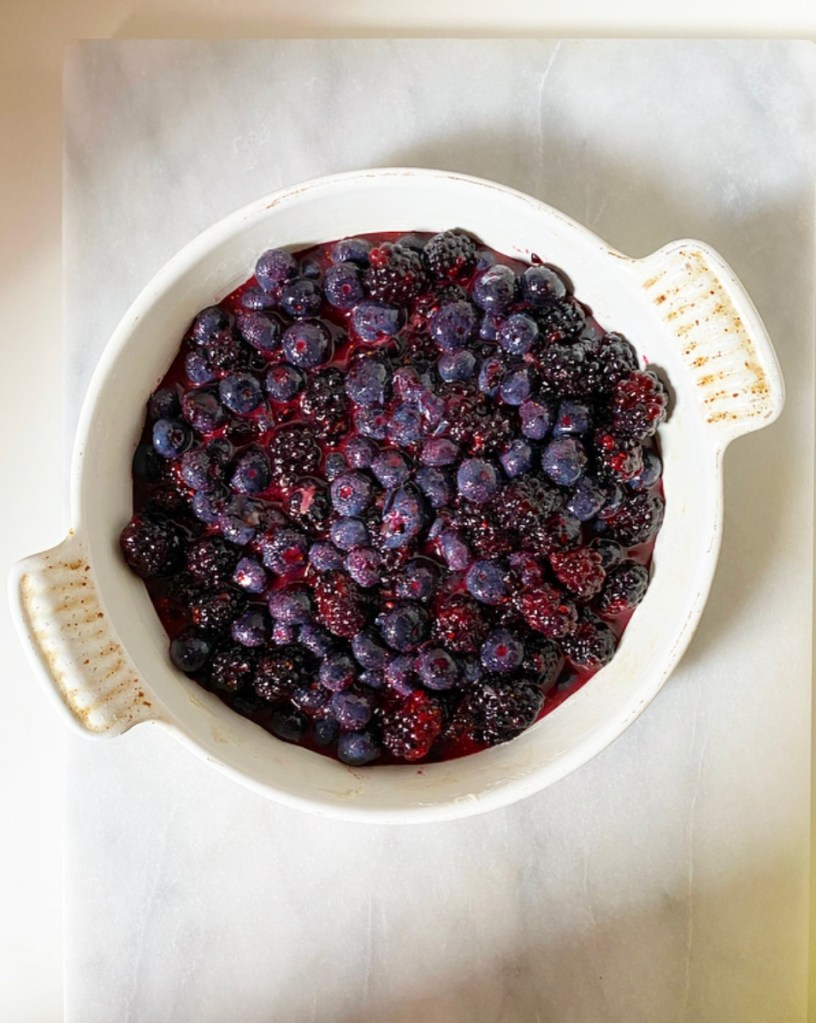 Transfer berry filling into the prepared casserole dish. Scatter topping onto the berries.