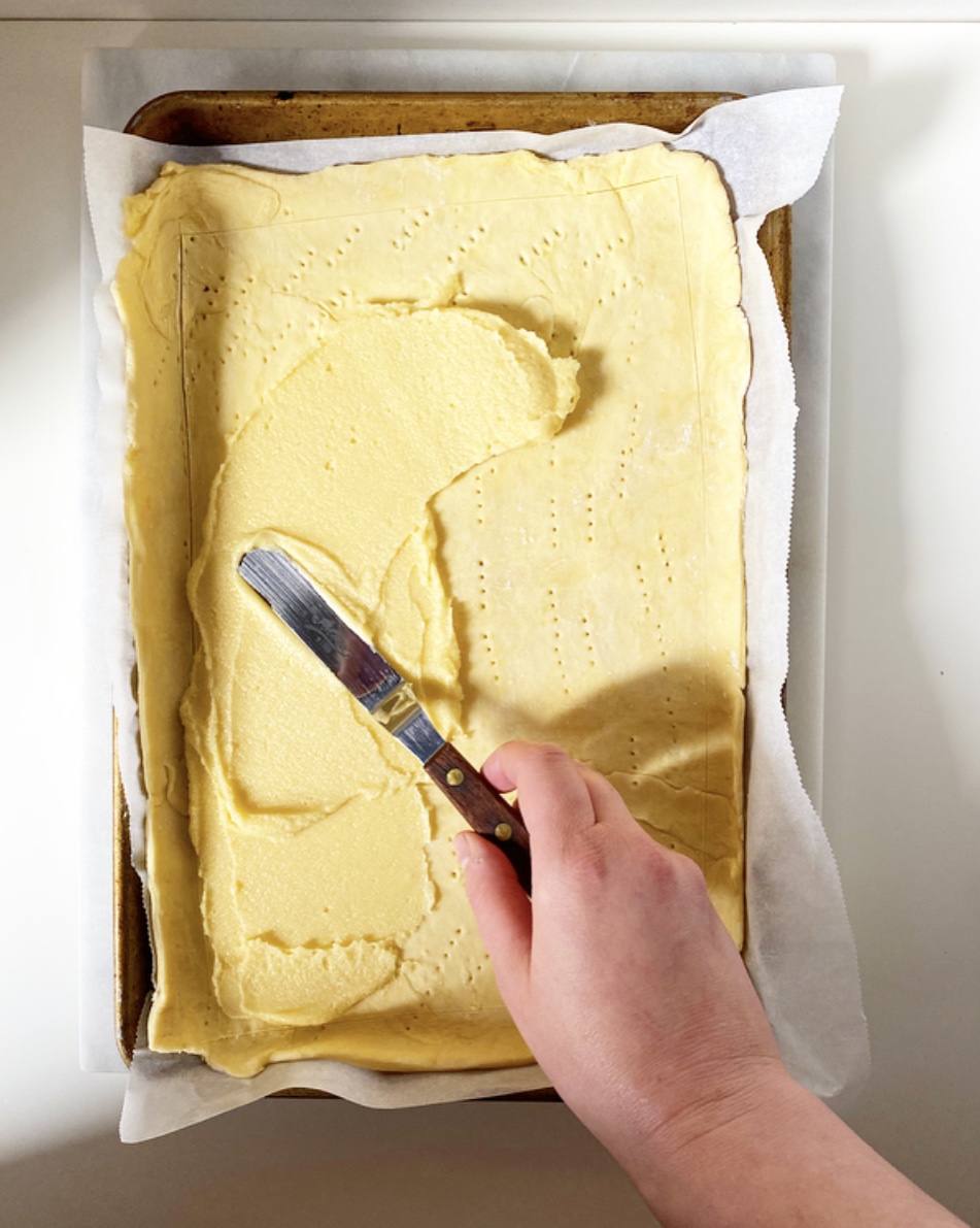 Flour a surface and a rolling pin. Unfold dough. Roll dough out to 10x14-inch rectangle. Transfer dough to the prepared pan. Trim any excess overhang. Use your knife to score a rectangle on the dough, so that there is a 1/2-inch border on all sides. Dock the center rectangle of the dough with a fork. Refrigerate.