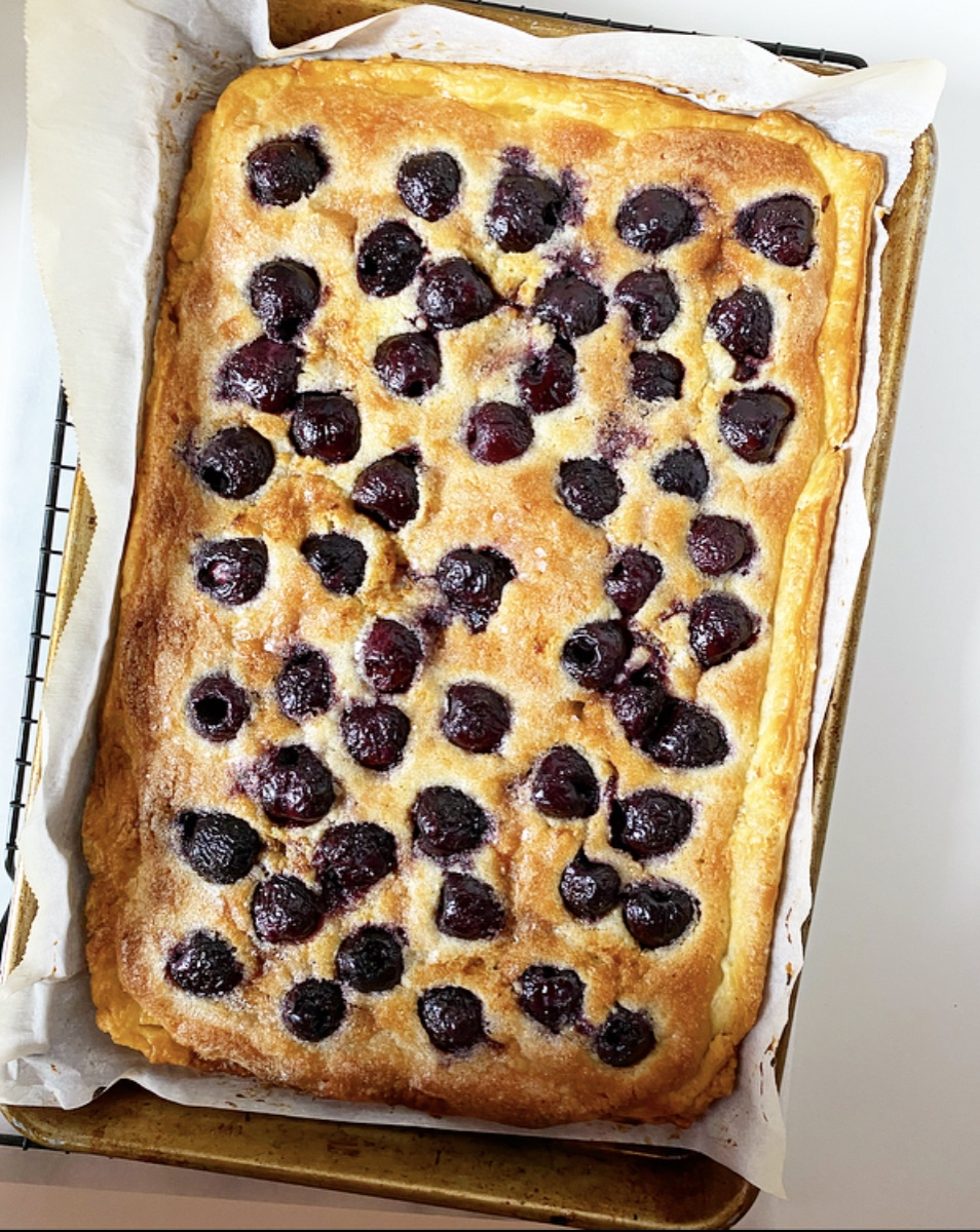 The secret? Frangipane aka almond pastry cream. It’s easy to make—it’s just a blend of almond flour (or whole blanched almonds), sugar, eggs and a few other baking staples—and is spread into a thin layer between rough puff pastry dough and a bevy of pitted whole cherries. As it bakes, this thin blanket of almond cream puffs up and nearly envelops the cherries, and gets a touch dark on top.