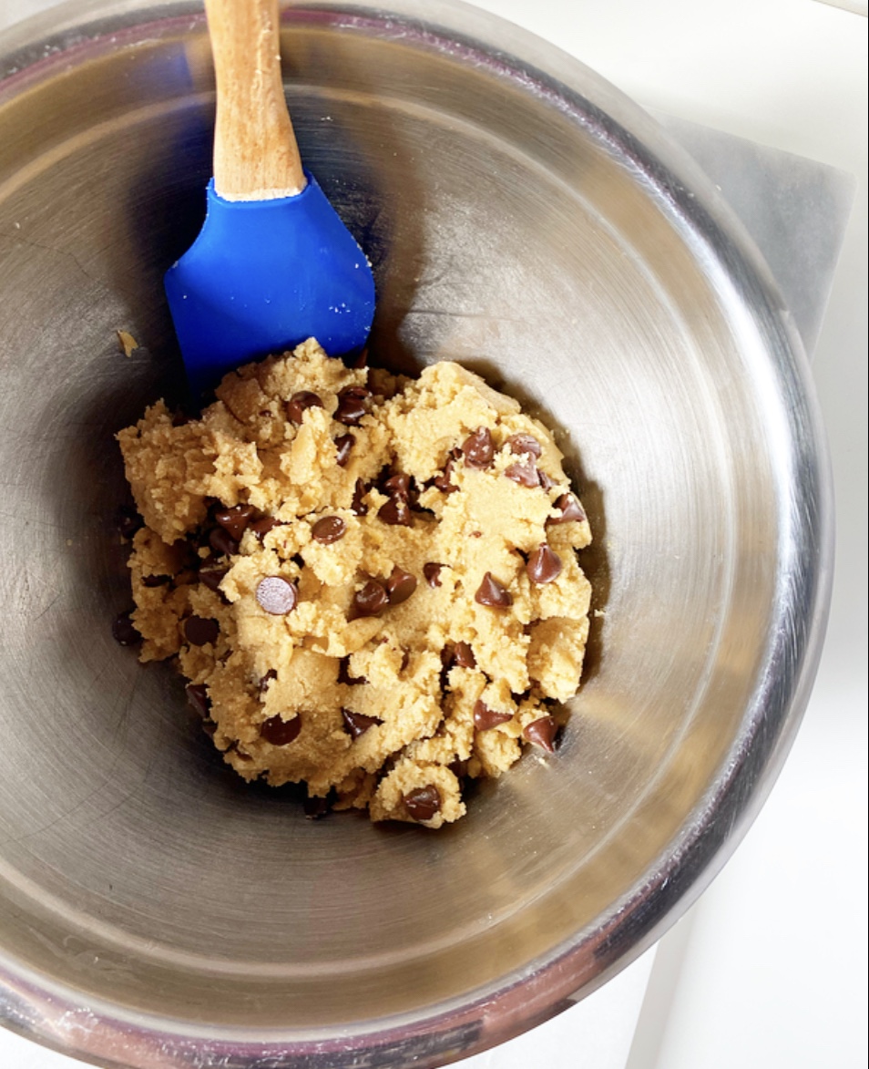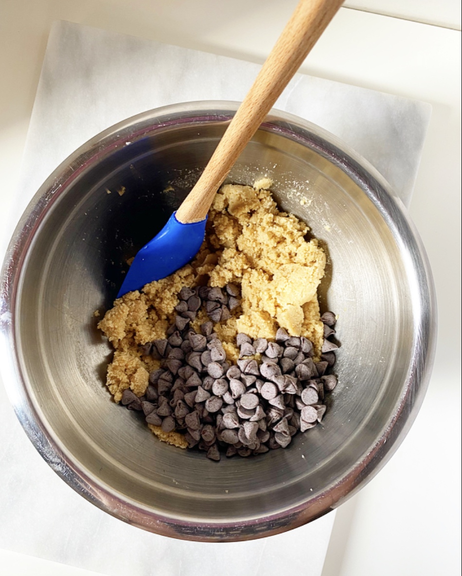 In a small bowl, whisk together melted vegan butter, water and vanilla. Add wet ingredients to dry, then use a silicone spatula or wooden spoon to combine. Mixture may be crumbly but should hold together when pinched. Fold in chocolate chips with the silicone spatula or your hand.