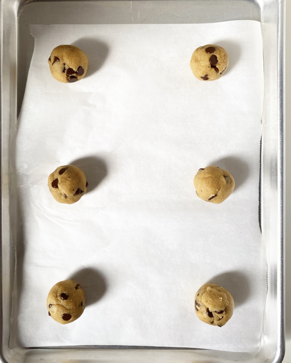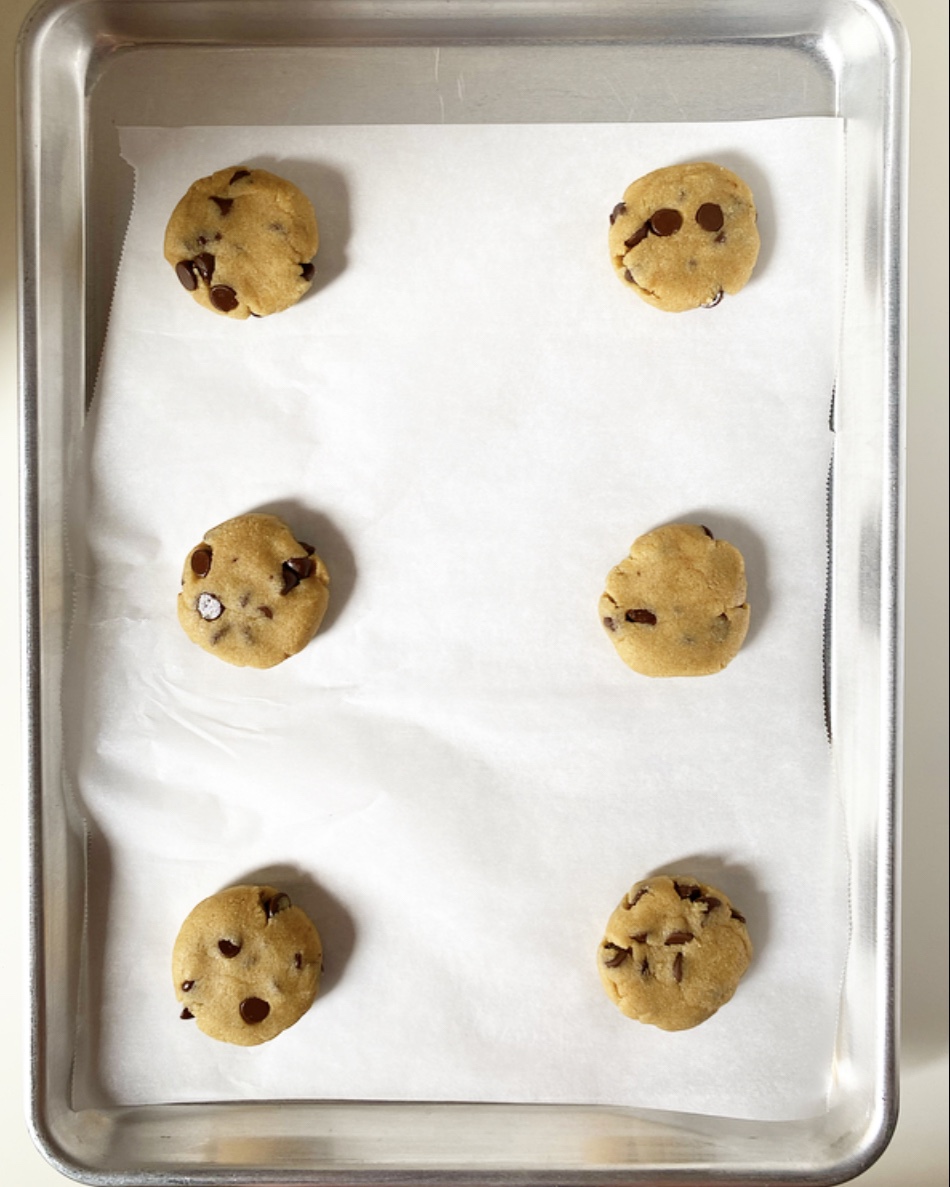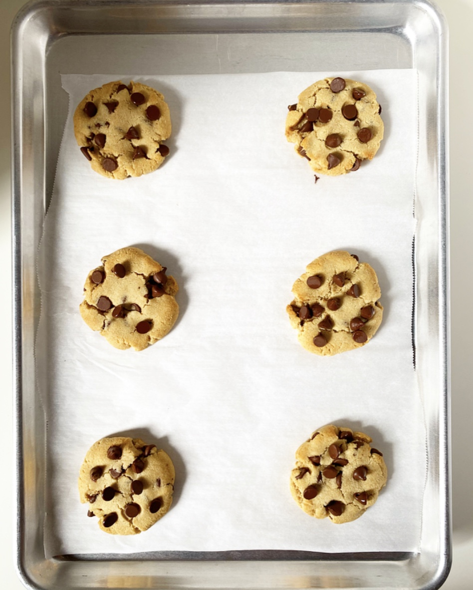 The dough comes together in just a few minutes, then gets separated into two-tablespoon increments and flattened into disks before baking. Because this dough doesn’t contain gluten or a particularly high volume of sugar, it doesn’t really spread like a traditional chocolate chip cookie, though it does puff in the most satisfying way.