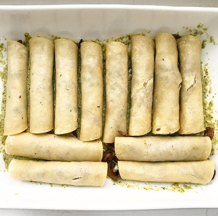 Grease a 9×13-inch casserole or baking dish. Spread 1/2 cup of the sauce over the bottom of the pan. Working with one tortilla at a time, top with 2-3 tablespoons of mushrooms, roll tightly, and place seam-side-down in prepared pan. Repeat process until all mushrooms have been used. Top with sauce and cover the pan with foil. Bake 15 minutes. Remove foil and bake an additional 5-10 minutes, until golden at the edges. Scatter more toasted pepitas over the top. Let cool ten minutes before serving.