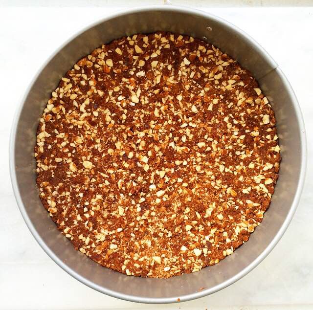The filling gets poured over a simple three-ingredient crust. To make the crust, combine 13 dates, a cup of almonds, and four tablespoons of cinnamon* in the bowl of your food processor. Whirl everything until the almonds are completely broken down, and the mixture holds together when you pinch it between your fingers. Then press it into an even layer on the bottom of a springform pan and top it with the filling.