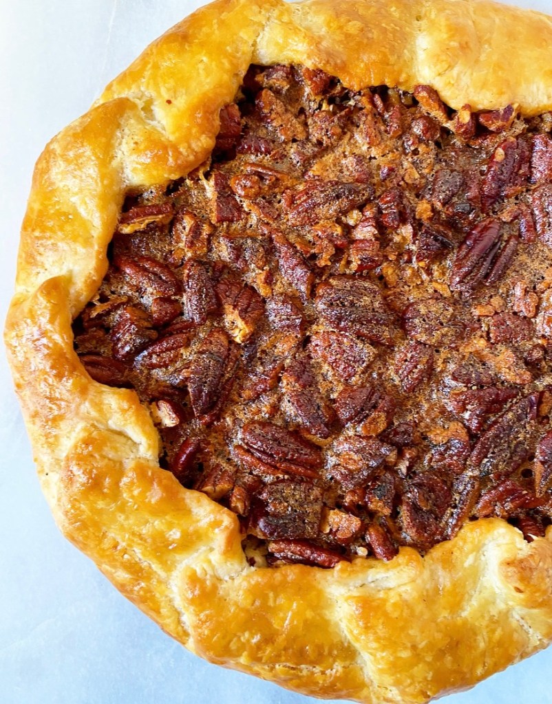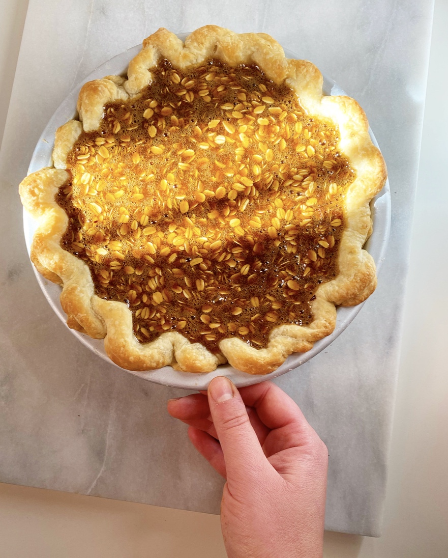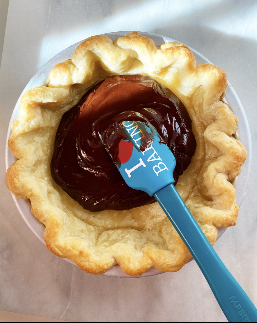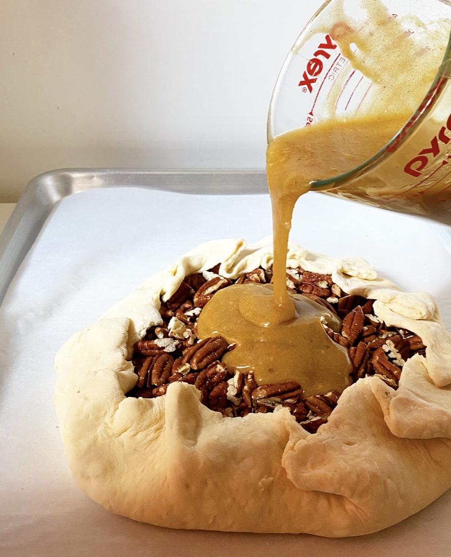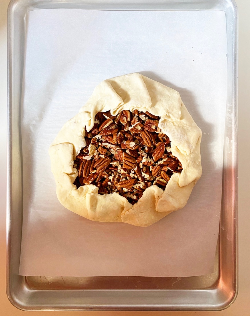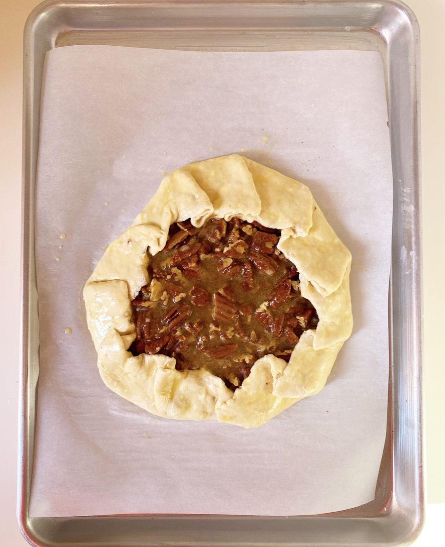 Place the prepared pie crust on a rimmed baking sheet and bake for 20-25 minutes, or until pie crust has “set” and is starting to turn golden in places, but is far from done. Use parchment to lift out pie weights. Return crust to the oven for 10 minutes, then set aside.