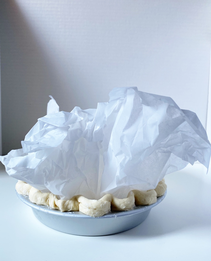 Remove pie crust from the freezer. Prick the bottom several times with the tines of a fork. Line frozen crust with a big piece of parchment. Fill the center with pie weights (or dried beans or rice).