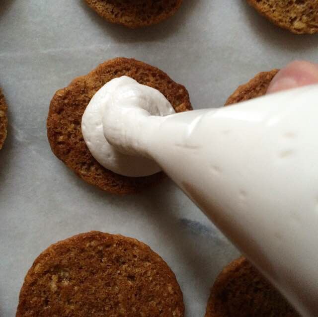 1. To assemble a sandwich cookie by piping, apply filling by pipe a circle in the middle of the underside of one cookie, leaving about 1/4″ around the edge. Top with a second plain cookie, with the underside filling-side-in. Repeat until all cookies have been used.