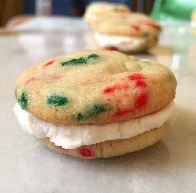 Today’s sandwich cookies are my version of a favorite treat from my teenage years. Back then, I was on the high school dance team. Once classes were over for the day, I’d have thirty minutes to change and eat something before practice. Usually the whole team would go for some sort of fast food (ah, teenage metabolism), but occasionally, when everyone was attending tutorials or some other after-school program, I’d zip over to Ridgmar Mall, run to the cookie kiosk, and grab one or two (okay, okay, three!) miniature M&Ms sandwich cookies before driving back to school to dance off all the calories.