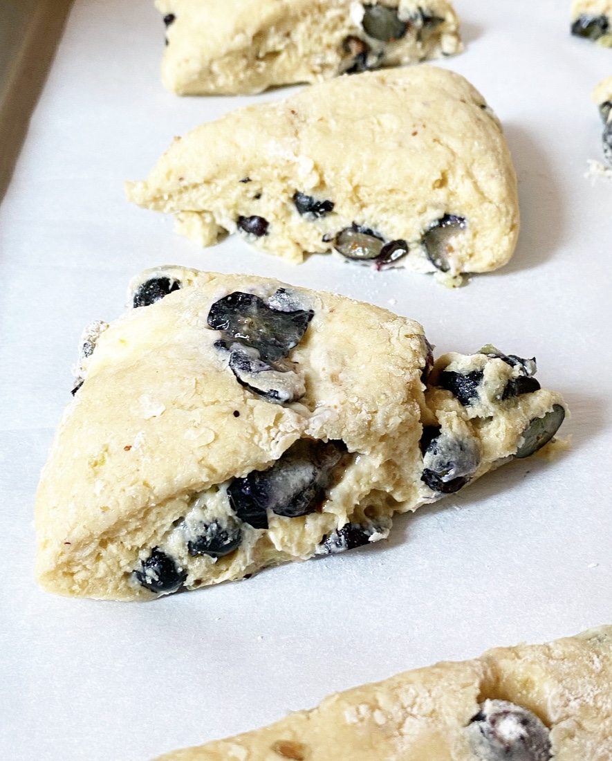 Blueberry Sour Cream Scones start just how any other scone recipe might—cutting butter into dry ingredients—but where the next step is usually to add heavy cream or half & half, these are bound with an egg and 1/2 cup of sour cream. The dough may simultaneously seem both too wet and too dry during mixing (weird and true), but it will come together. Once mixed, it’s filled with blueberries, formed into a disk and sliced into wedges before baking.