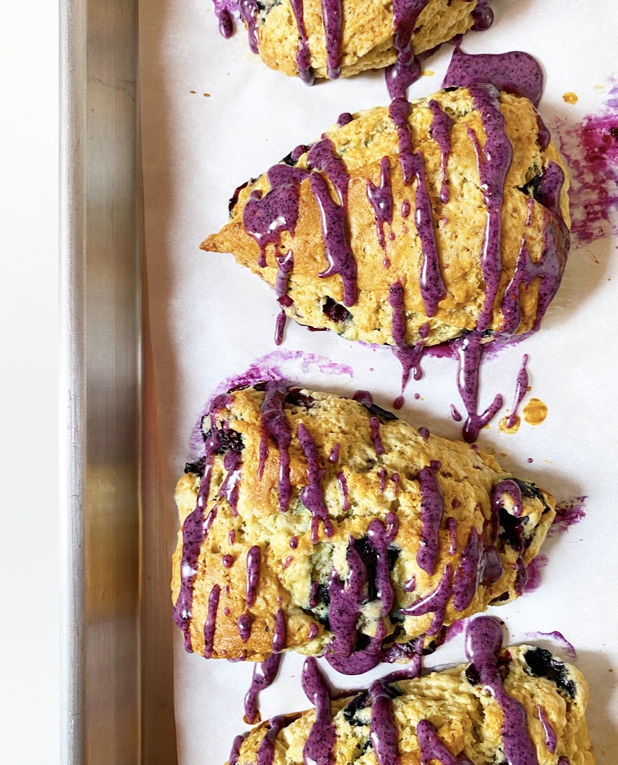 These scones bake up craggy and golden with juicy burst blueberries throughout. You may serve them as soon as you can handle them, but you can also wait a few more minutes and give them a drizzle with a quick blueberry glaze. You know, if you’re the kind of person who needs your Blueberry Sour Cream Scones to have a vibrant purple drizzle…which I very much am.