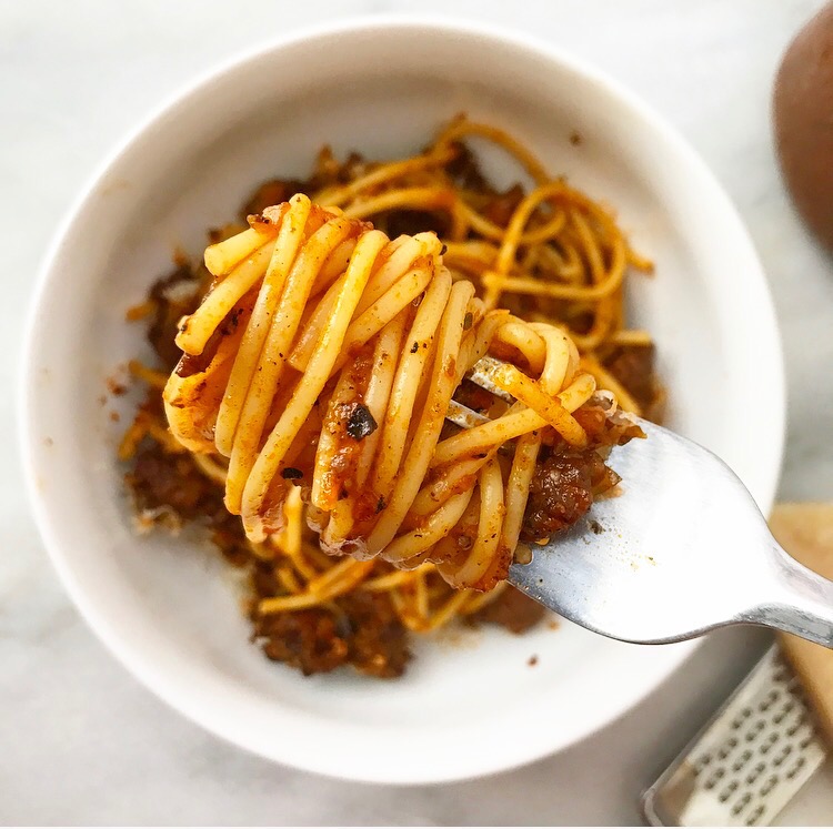 You know the stuff: shredded mozzarella, spoonfuls of parmesan-spiked ricotta, the bolognese, some no-boil noodles… Yeah, I use the no-boil noodles—they’re one of the only convenience ingredients that I will swear by. I’ve used the boil-yourself kind and they are delicious, but they can be finicky and take a while. I like saving myself a little stress. I mean, I already made the sauce from scratch. That said, use whichever noodles work for you.