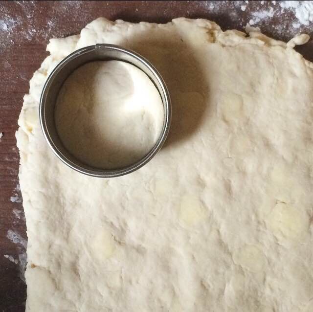 Cut dough with a biscuit cutter or sharp knife (not serrated). Cut directly down. Place biscuits close together in your prepared pan. Pat biscuit dough scraps into a cohesive piece, and cut until you have used all your dough.